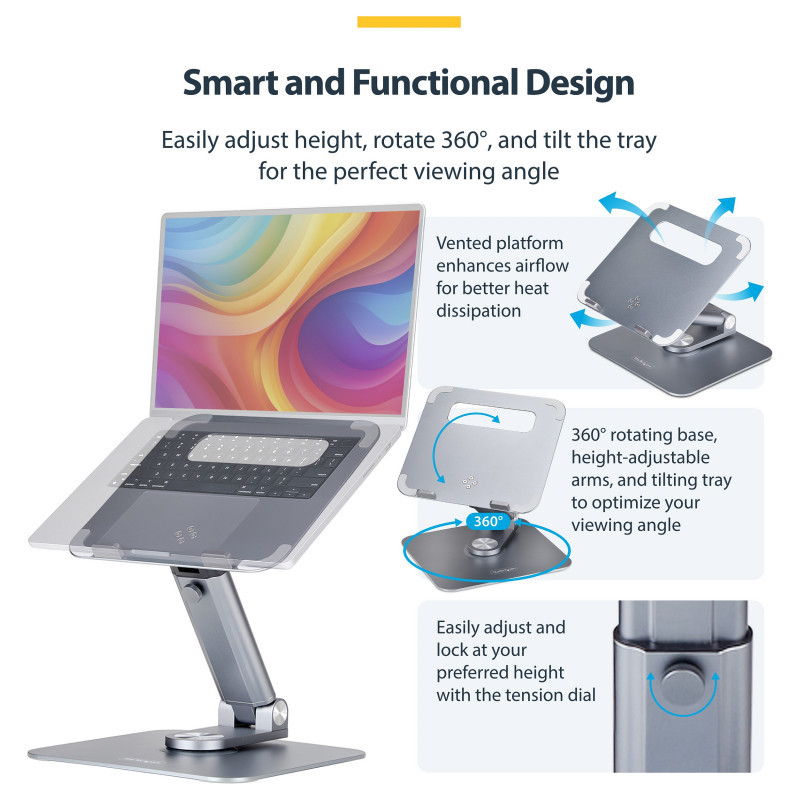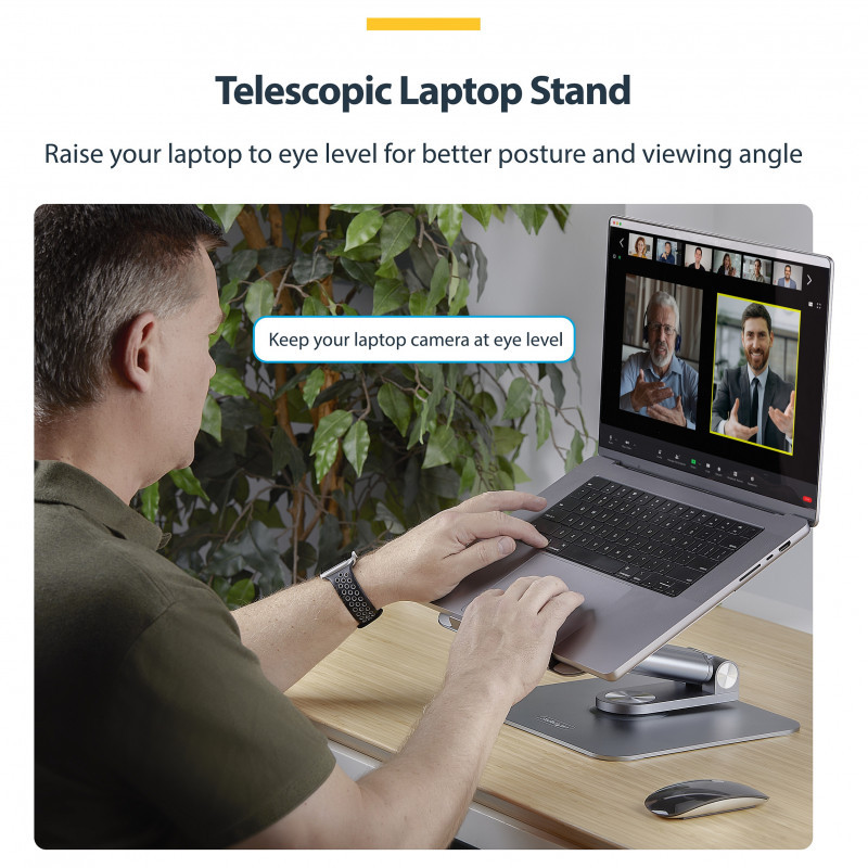 "StarTech.com Telescopic Laptop Stand, 360 Swivel Base, Rotating Computer Riser for Desk, Adjustable Height and Tilt, Max 11lb/5kg, Aluminum Build, Portable Design. Product type: Laptop stand, Product colour: Silver, Material: Aluminium. Swivel angle: 360°. Width: 230.5 mm, Depth: 260 mm, Height: 80 mm. Package width: 285 mm, Package depth: 294 mm, Package height: 92 mm. Master (outer) case width: 595 mm, Master (outer) case length: 495 mm, Master (outer) case height: 320 mm"\n"Work comfortably by bringing your laptop closer to eye level for better ergonomics and viewing angle