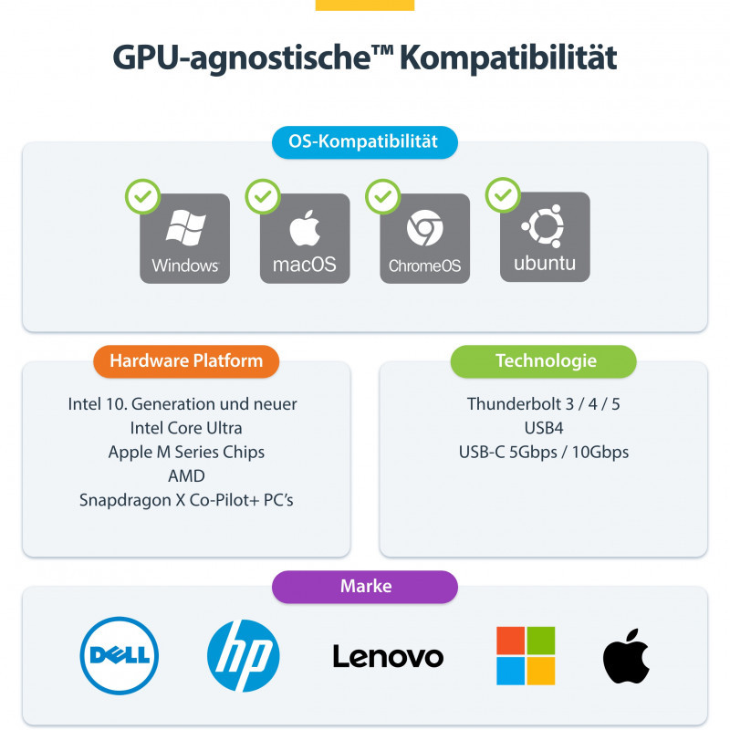 This triple-4K docking station uses a combination of its integrated DisplayLink® graphics controller and your computer's DP Alt Mode enabled USB-C port to provide three independent 4K displays.