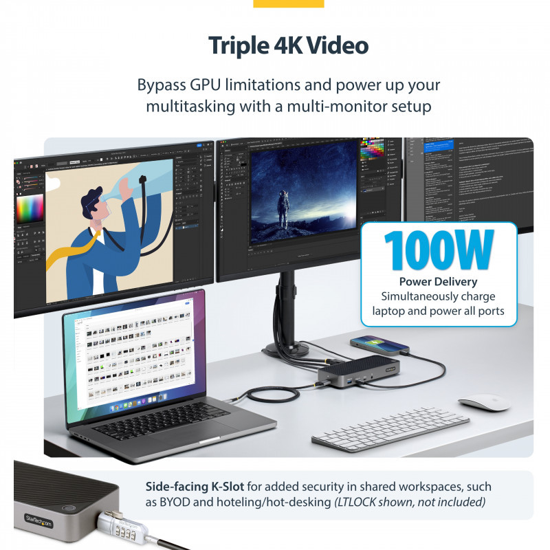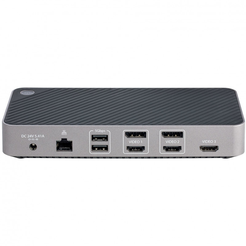 "StarTech.com USB-C Triple Monitor Docking Station - HDMI/DP Triple 4k USB-C Dock - 5x USB Hub - GbE - 100W PD - Universal Multi Monitor Docking Station - Thunderbolt 3/4 Compatible. Connectivity technology: Wired, Host interface: USB 3.2 Gen 2 (3.1 Gen 2) Type-C, USB Power Delivery up to: 100 W. Copper ethernet cabling technology: 10BASE-T, 100BASE-TX, 1000BASE-T, Networking standards: IEEE 802.3ab. Product colour: Grey, Silver, Data transfer rate: 10 Gbit/s, HD type: 4K Ultra HD. AC input voltage: 100 - 240 V, Input current: 2.5 A, Output voltage: 24 V. Windows operating systems supported: Windows 10, Windows 10 Education, Windows 10 Education x64, Windows 10 Enterprise, Windows 10..., Mac operating systems supported: Mac OS X 10.11 El Capitan, Mac OS X 10.12 Sierra, Mac OS X 10.14 Mojave, Mac OS X 10.15 Catalina,..., Mobile operating systems supported: Android"\n"Seamlessly standardize across platforms with triple 4K display support