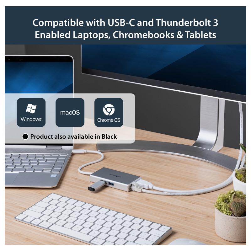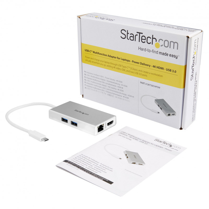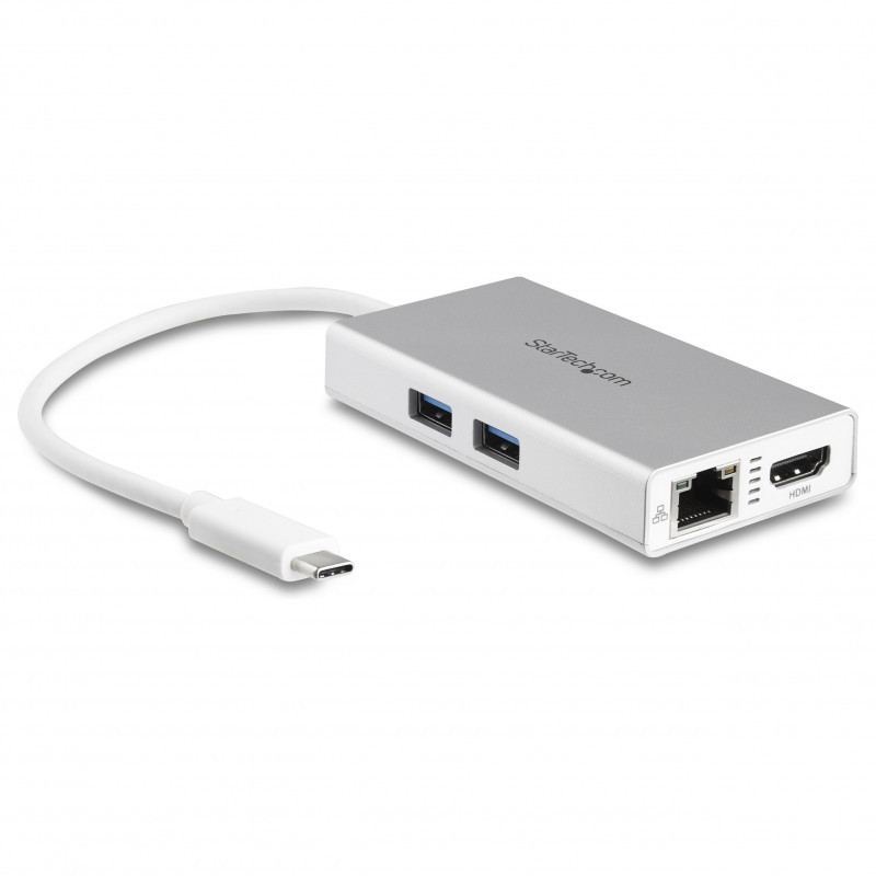 "StarTech.com USB-C Multiport Adapter - USB-C Travel Docking Station w/ 4K HDMI - 60W Power Delivery Pass-Through, GbE, 2pt USB-A 3.0 Hub - Portable Mini USB Type-C Dock for Laptop - White. Connectivity technology: Wired, Host interface: USB 3.2 Gen 1 (3.1 Gen 1) Type-C, USB Power Delivery up to: 60 W. Ethernet LAN data rates: 10,100,1000 Mbit/s, Networking standards: IEEE 802.3, IEEE 802.3ab, IEEE 802.3u. Product colour: Silver, White, Data transfer rate: 5 Gbit/s, Maximum digital resolution: 4096 x 2160 pixels. Power source type: USB, Power supply: 60 W. Windows operating systems supported: Windows 10 Education, Windows 10 Education x64, Windows 10 Enterprise, Windows 10 Enterprise x64,..., Mac operating systems supported: Mac OS X 10.10 Yosemite, Mac OS X 10.11 El Capitan, Mac OS X 10.12 Sierra, Mac OS X 10.13 High..., Other operating systems supported: ChromeOS"\n"Portable Docking Station | Mac & Windows® | GbE | Thunderbolt™ 3 Compatible | TAA