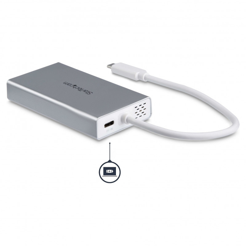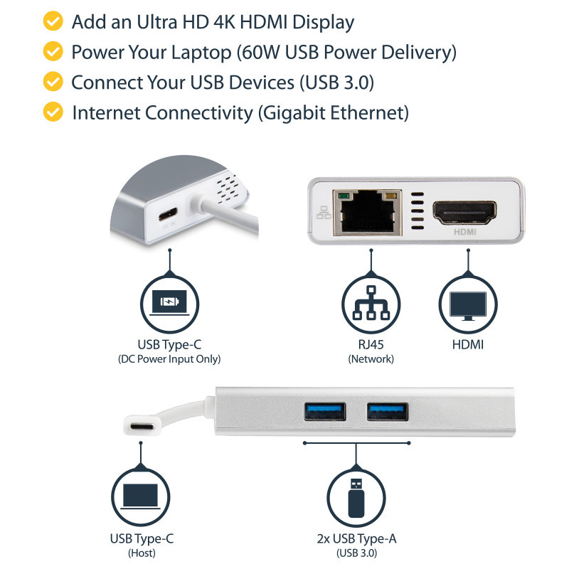 The versatile USB-C adapter lets you create a dual-monitor workstation virtually anywhere, providing 4K Ultra HD (3840 x 2160p) HDMI output with 30 Hz refresh rate and audio, two USB 3.0 ports, and a Gigabit Ethernet port, with support for USB Power Delivery 2.0.