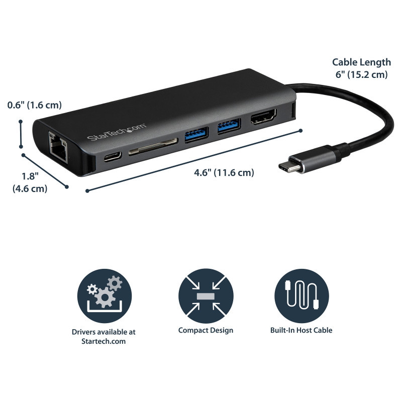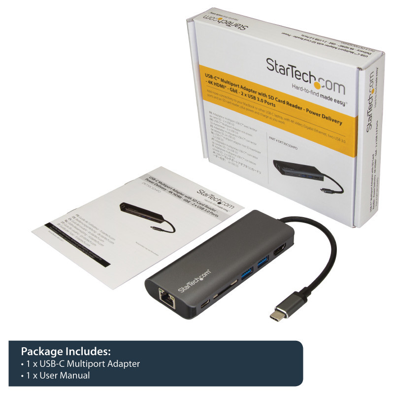 "StarTech.com USB C Multiport Adapter, Portable USB-C Dock to 4K HDMI, 2-pt USB 3.0 Hub, SD/SDHC, GbE, 60W PD Pass-Through - USB Type-C/Thunderbolt 3 - REPLACED BY DKT30CHSDPD1. Connectivity technology: Wired, Host interface: USB 3.2 Gen 1 (3.1 Gen 1) Type-C. Ethernet LAN data rates: 10,100,1000 Mbit/s, Networking standards: IEEE 802.3, IEEE 802.3ab, IEEE 802.3u. Product colour: Black, Grey, Compatible memory cards: MMC, SD, Data transfer rate: 5 Gbit/s. Power source type: USB, Power supply: 60 W. Windows operating systems supported: Windows 10, Windows 10 Education, Windows 10 Education x64, Windows 10 Enterprise, Windows 10..., Mac operating systems supported: Mac OS X 10.11 El Capitan, Mac OS X 10.12 Sierra, Mac OS X 10.13 High Sierra, Mac OS X 10.14..., Other operating systems supported: ChromeOS"\n"Add more connectivity to your MacBook or other USB-C laptop, with 4K video, Gigabit Ethernet, two USB 3.0 ports and an SD card reader, plus power and charge as you work