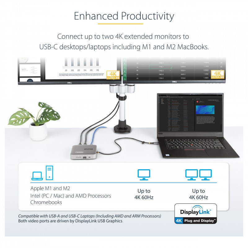 "StarTech.com USB C Docking Station, Dual 4K 60Hz HDMI compatible with Macbook Pro (M1/M2/M3/M4) and Windows, USB-A/USB-C 10Gbps Hub, 100W Power Delivery, GbE, SD, 22in/56cm Cable. Connectivity technology: Wired, Host interface: USB 3.2 Gen 2 (3.1 Gen 2) Type-C, USB Power Delivery up to: 100 W. Ethernet LAN data rates: 10,100,1000 Mbit/s. Product colour: Grey, Colour name: Space Gray, Compatible memory cards: MMC, SD. Power source type: USB. Windows operating systems supported: Windows 10, Windows 10 Education, Windows 10 Education x64, Windows 10 Enterprise, Windows 10..., Mac operating systems supported: Mac OS X 10.11 El Capitan, Mac OS X 10.12 Sierra, Mac OS X 10.14 Mojave, Mac OS X 10.15 Catalina,..., Linux operating systems supported: Ubuntu 18.04 LTS, Ubuntu 20.04 LTS"\n"USB-C Dock | 2-Port USB 3.2 Gen 2 10Gbps Hub (1x USB-A, 1x USB-C) | Dual 4K 60HZ HDMI | 100W PD Passthrough