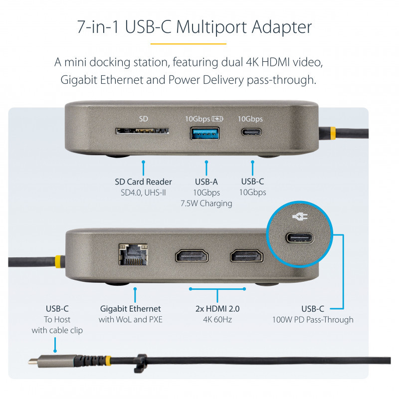 This USB-C Mini Dock / Multiport Adapter supports up to dual 4K 60Hz HDMI 2.0 converting your Dell XPS, MacBook or other USB-C laptop or tablet into a workstation, anywhere you go. The USB Type-C™ Multiport Adapter features 2x HDMI video outputs, a 2-Port USB 3.2 Gen 2 (10 Gbps) Hub (1x USB-A with B.C 1.2 charging, and 1x USB-C), an SD card reader, and Gigabit Ethernet. The adapter connects to your host computer's USB-C, USB4, or Thunderbolt 3/4™ port. Charge your host laptop and any attached USB peripherals by connecting the host laptop's power supply to the dedicated USB Power Delivery (PD) 3.0 port. The Multiport Adapter features an extra-long attached 22-inch (55 cm) host cable - for an extended reach, to offer more set up flexibility.