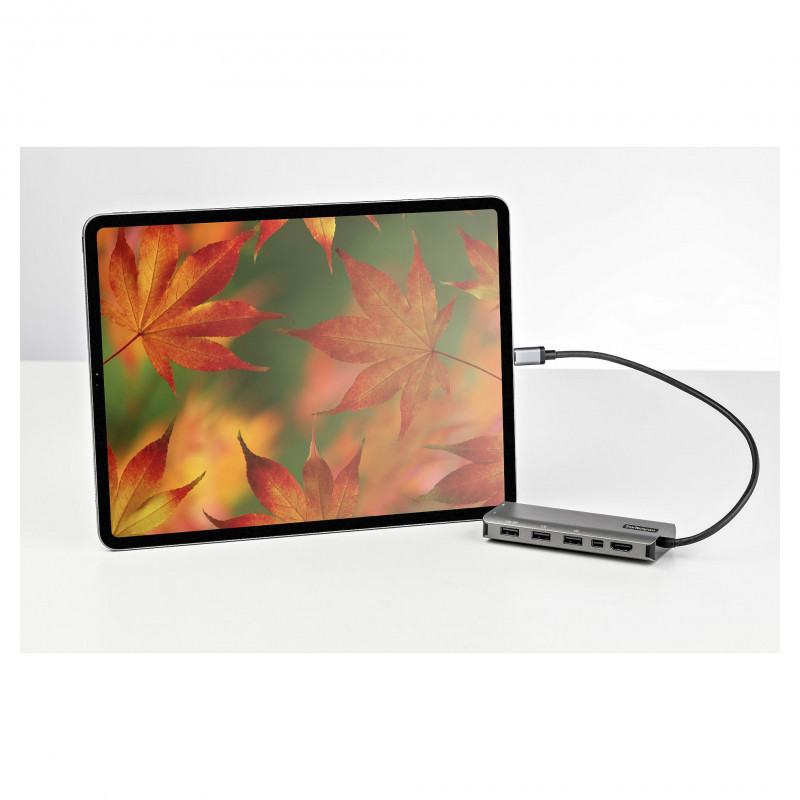 "StarTech.com USB C Multiport Adapter - USB-C to HDMI or Mini DisplayPort 4K 60Hz, 100W Power Delivery Pass-Through, 4-Port 10Gbps USB Hub - USB Type-C Mini Dock - w/ 12"" Attached Cable. Connectivity technology: Wired, Host interface: USB 3.2 Gen 1 (3.1 Gen 1) Type-C, USB Power Delivery up to: 100 W. Product colour: Black, Silver, Data transfer rate: 10 Gbit/s, HD type: 4K Ultra HD. Power consumption (typical): 15 W. Windows operating systems supported: Windows 10, Windows 10 Education, Windows 10 Education x64, Windows 10 Enterprise, Windows 10..., Mac operating systems supported: Mac OS X 10.13 High Sierra, Mac OS X 10.14 Mojave, Mac OS X 10.15 Catalina, Mac OS X 10.15.3..., Linux operating systems supported: Ubuntu 18.04 LTS, Ubuntu 20.04 LTS. Width: 425 mm, Depth: 46.8 mm, Height: 160 mm"\n"USB-C Multiport Adapter | HDMI & Mini DisplayPort Video | 100W PD Pass-Through | 4-Port USB Hub