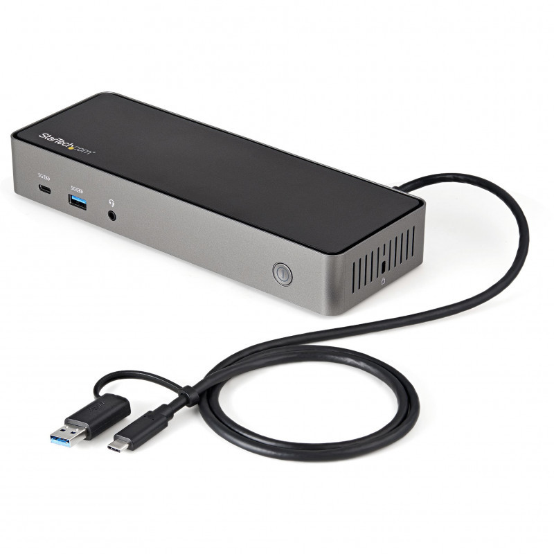 "StarTech.com USB-C & USB-A Dock - Hybrid Universal Triple Monitor Laptop Docking Station DisplayPort & HDMI 4K 60Hz - 85W Power Delivery, 6x USB Hub, GbE, Audio - USB 3.1 Gen 2 10Gbps - TAA. Connectivity technology: Wired, Host interface: USB 3.2 Gen 2 (3.1 Gen 2) Type-C, USB Power Delivery up to: 85 W. Ethernet LAN data rates: 10,100,1000 Mbit/s. Product colour: Black, Grey, Data transfer rate: 10 Gbit/s, Maximum digital resolution: 3840 x 2160 pixels. AC input voltage: 100 - 240 V, Input current: 2.5 A, Output voltage: 20 V. Windows operating systems supported: Windows 10, Windows 10 Education, Windows 10 Education x64, Windows 10 Enterprise, Windows 10..., Mac operating systems supported: Mac OS X 10.10 Yosemite, Mac OS X 10.11 El Capitan, Mac OS X 10.12 Sierra, Mac OS X 10.13 High..."\n"USB-C & USB-A Dock | USB 3.2 Gen 2 10Gbps | 4K 60HZ HDMI | DisplayPort | 85W Power Delivery