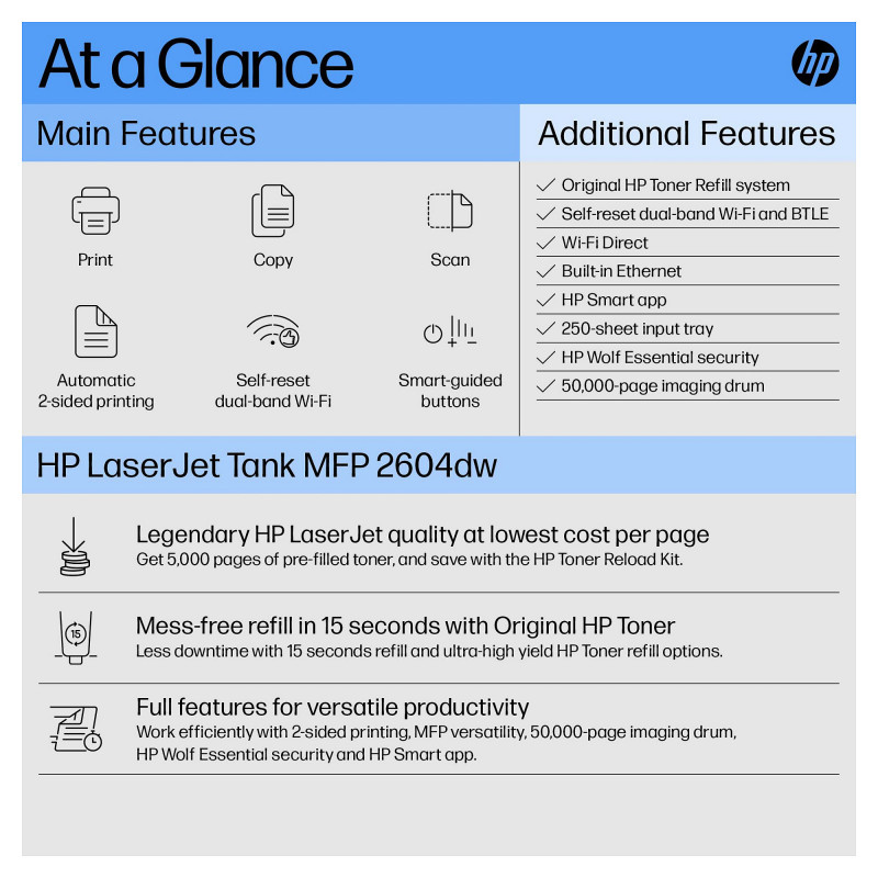 "HP LaserJet Tank MFP 2604dw Printer. Print technology: Laser, Printing: Mono printing, Maximum resolution: 600 x 600 DPI. Copying: Mono copying. Scanning: Colour scanning, Optical scanning resolution: 600 x 600 DPI. Duplex functions: Print. Maximum ISO A-series paper size: A4. Wi-Fi. Direct printing. Product colour: Grey"\n"Powerful productivity. Super-affordable refill. Discover business-ready capabilities and savings with HP LaserJet Tank MFP 2604dw All-in-One Printer pre-filled with up to 5,000 pages of Original HP Toner.[1]