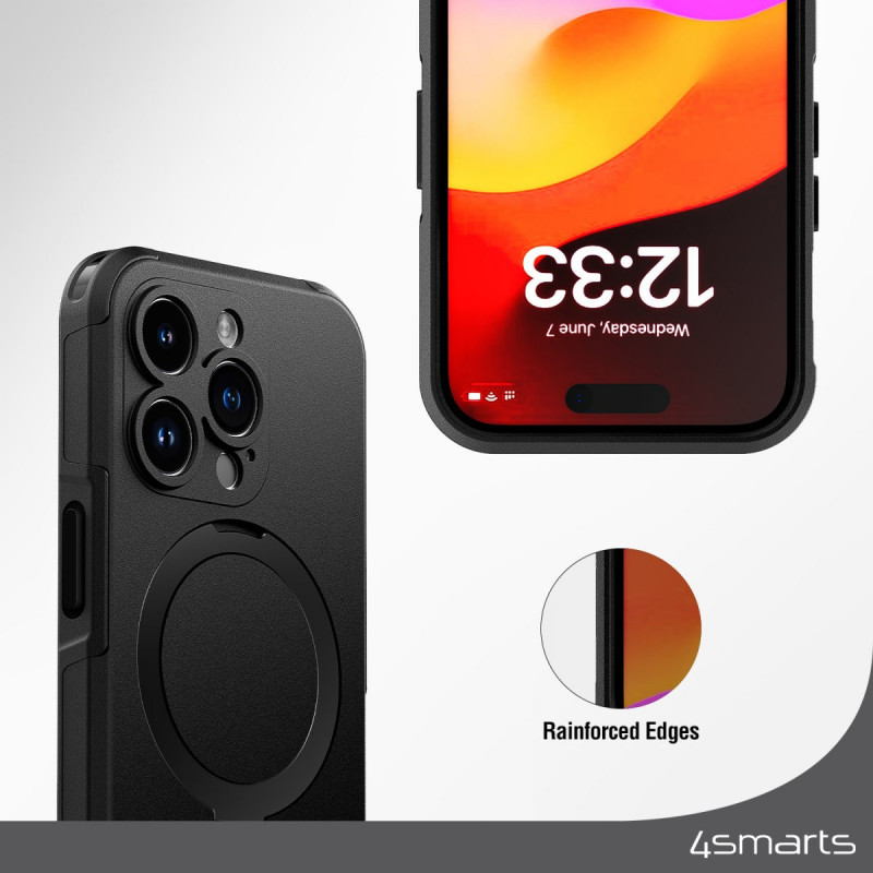 "4smarts Defend Case. Case type: Shell case, Brand compatibility: Apple, Compatibility: iPhone 15 Pro, Maximum screen size: 15.5 cm (6.1""), Surface coloration: Monochromatic, Product colour: Black, Desktop stand"\n"MAGSAFE COMPATIBLE