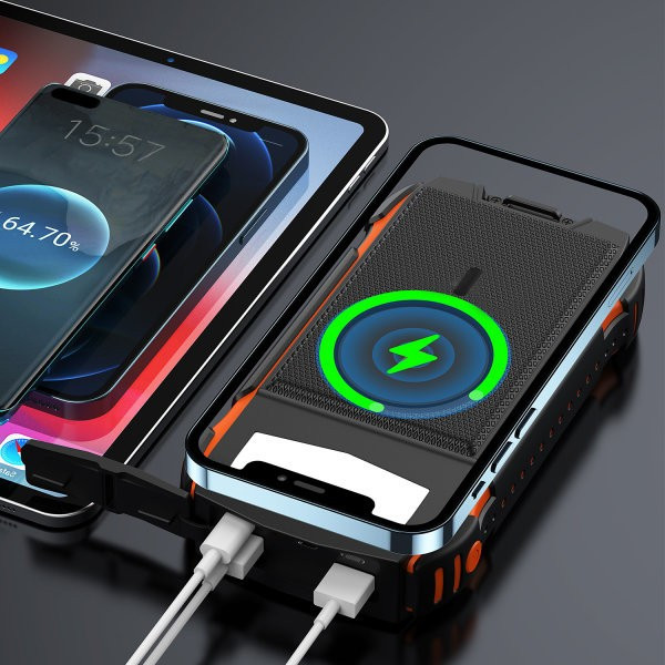 "4smarts TitanPack UltiMag. Battery capacity: 20000 mAh, Battery technology: Lithium Polymer (LiPo), Fast charging technology: Quick Charge 3.0, Battery voltage: 12 V. USB Type-A output ports: 2, USB Type-C ports quantity: 1. Wireless charging. Output current: 1.5 A. Product colour: Black, Orange"\n"- Eco solar charging: Charge your devices with green, eco-friendly solar energy.