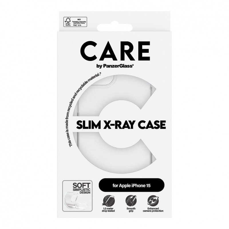"PanzerGlass CARE™ by ® X-Ray Case iPhone 15. Case type: Cover, Brand compatibility: Apple, Compatibility: Apple - iPhone 15, Product colour: Transparent"\n"A clear choice for protection and style. Let your phone’s true color shine through. With a soft, slim design, this protective case is durable inside and out. And with its smooth grip it looks as good as it feels. Drop-tested at 1.2 meters, this case is designed to endure everyday falls and scratches. The X-Ray case, made from recycled plastic, is designed for wireless charging and enhanced camera protection.
