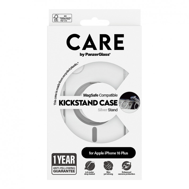 "PanzerGlass CARE™ by ® Case Transparent w. Silver Kickstand & MagSafe iPhone 16 Plus. Case type: Cover, Brand compatibility: Apple, Compatibility: Apple - iPhone 16 Plus, Product colour: Transparent"\n"One of our most anticipated new products is finally available! Every angle and corner has been drop-tested at 4.8 meters. Made from recycled plastic, this case offers phenomenal protection, wireless charging, and MagSafe compatibility, and includes our 1 Year Anti-Yellowing guarantee – no questions asked. This slim, light-weight protective kickstand case offers everything you want is a phone case. It’s practical design features a versatile kickstand for hands-free viewing, both vertical and horizontal. Now you – or your kids – can FaceTime, stream series, watch movies, and do yoga with ease, any where, any time … and hands free. It even includes enhanced camera protection to safeguard your selfies and photos.