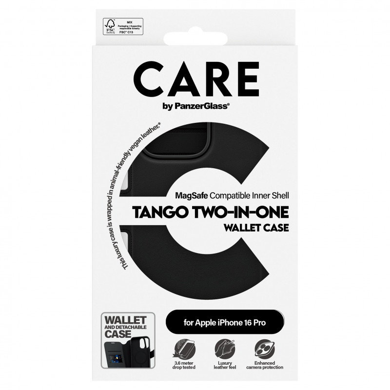 "PanzerGlass CARE™ by ® Tango 2-in-1 Wallet Case w. MagSafe iPhone 16 Pro. Case type: Cover, Brand compatibility: Apple, Compatibility: Apple - iPhone 16 Pro, Product colour: Black"\n"Tango Two-in-One Wallet Case It takes two to tango. This slim yet durable wallet-and-case-in-one has a luxurious leather-like feel. It’s a stylish combination of protection and convenience at your fingertips. More than just an accessory, this chic casual wallet features an easy open-and-close clasp and a detachable phone case wrapped in animal-friendly vegan leather, providing secure storage of up to four cards, including RFID blocking. And because it’s MagSafe and Qi compatible, you can enjoy seamless wireless charging without removing the case.