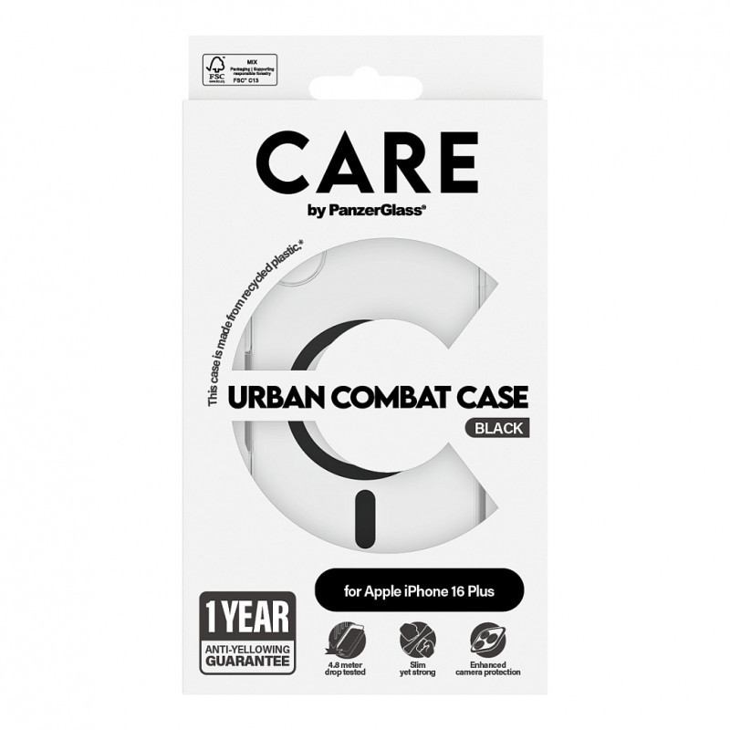 "PanzerGlass CARE™ by ® Urban Combat Case Transparent w. Black MagSafe iPhone 16 Plus. Case type: Cover, Brand compatibility: Apple, Compatibility: Apple - iPhone 16 Plus, Product colour: Black"\n"Our top pick. Call sign bombshell. Phenomenal protection designed for urban exploration and adventure. Every angle and corner has been drop tested at 4.8 meters. The Urban Combat case, made from recycled plastic, is designed for wireless charging and MagSafe compatibility. And it comes with our 1 Year Anti-Yellowing guarantee – no questions asked.