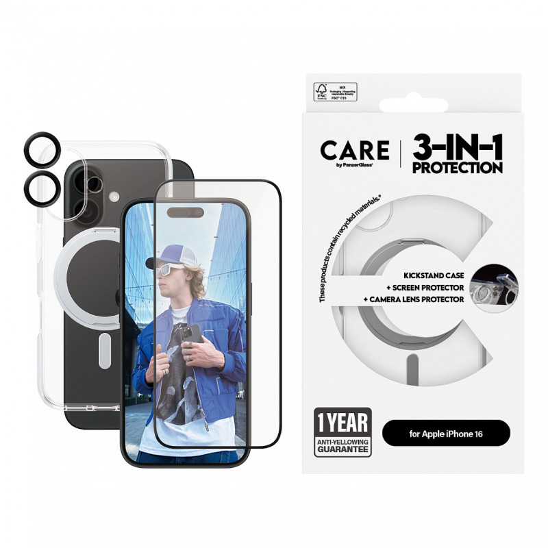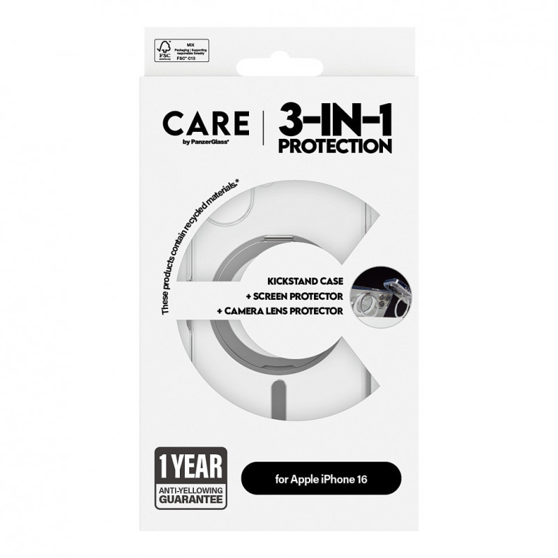 "PanzerGlass CARE™ by ® 3-in-1 Ceramic Bundle iPhone 16. Case type: Cover, Brand compatibility: Apple, Compatibility: Apple - iPhone 16, Product colour: Transparent"\n"Upgrade your phone's protection with the CARE by PanzerGlass® 3-in-1 Feature Bundle, designed for those who demand premium quality for their device. This bundle includes a Ceramic Screen Protector and Ceramic Hoops® camera lens protector by PanzerGlass®, and a Transparent Kickstand Case from CARE by PanzerGlass®. Together, they ensure your device stays safe while maintaining a premium look and feel that complements your style.