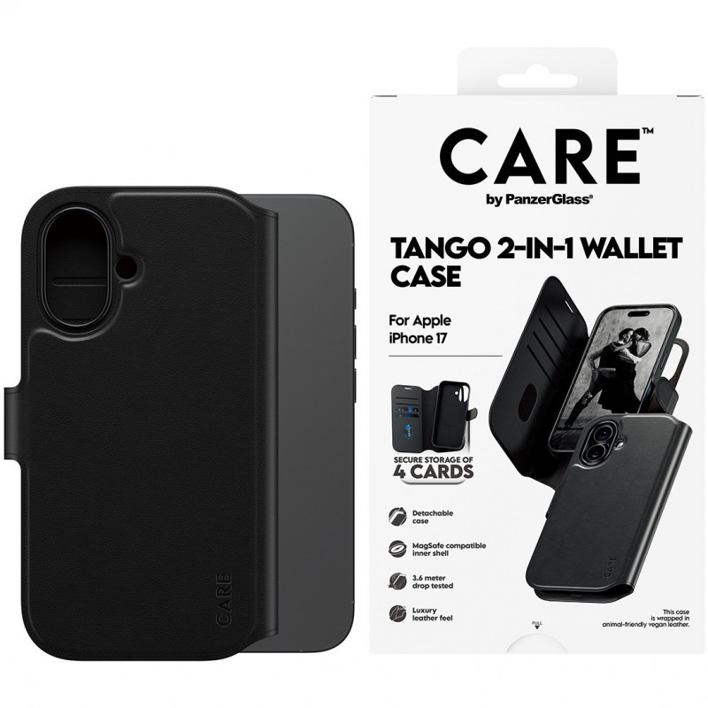 "PanzerGlass CARE by ® Feature Case Tango Two-in-One Walle Case w. MagSafe iPhone 17. Case type: Cover, Brand compatibility: Apple, Compatibility: Apple - iPhone 2025 non-Pro, Product colour: Black"\n"Tango Two-in-One Wallet Case It takes two to tango. This slim yet durable wallet-and-case-in-one has a luxurious leather-like feel. It’s a stylish combination of protection and convenience at your fingertips. More than just an accessory, this chic casual wallet features an easy open-and-close clasp and a detachable phone case wrapped in animal-friendly vegan leather, providing secure storage of up to four cards, including RFID blocking. And because it’s MagSafe and Qi compatible, you can enjoy seamless wireless charging without removing the case.