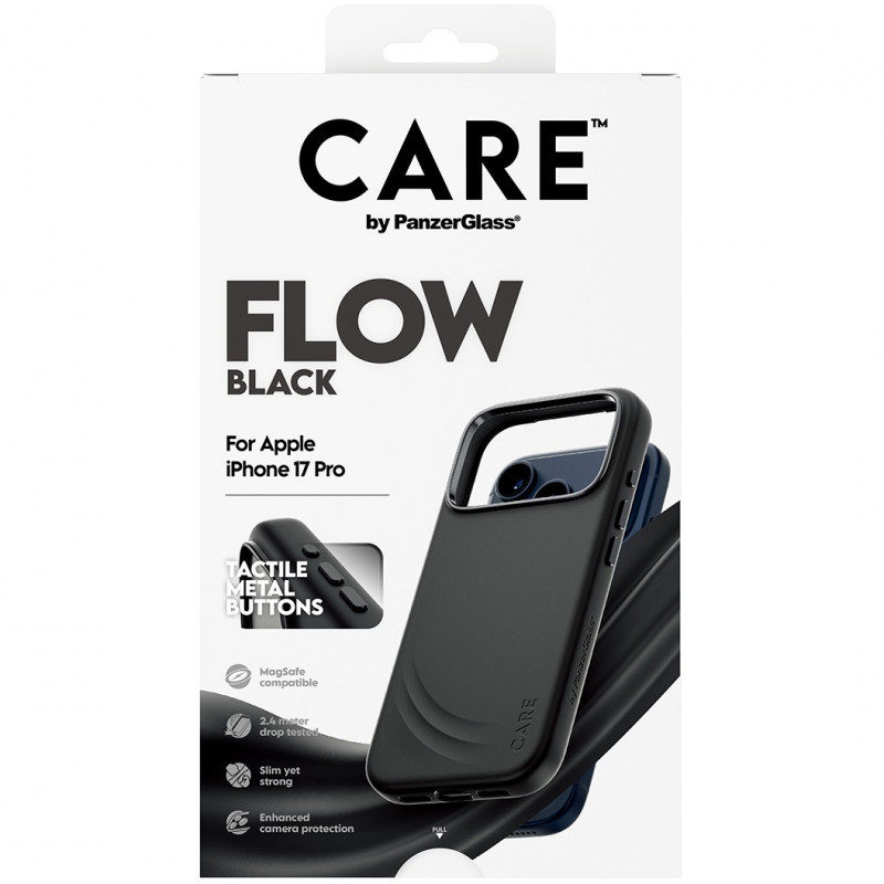 "PanzerGlass CARE by ® Feature FLOW Case Black w. MagSafe iPhone 17 Pro. Case type: Cover, Brand compatibility: Apple, Compatibility: Apple - iPhone 17 Pro, Surface coloration: Monochromatic, Product colour: Black"\n"Feel the flow! The CARE by PanzerGlass® Feature Flow Case with MagSafe is more than just a pretty face – it's your phone’s new best friend. The case is made with 60% recycled silicone and a soft-touch coating to wrap your device in everyday elegance and eco-love. Inside, a velvety microfiber lining gives your phone the care it deserves, while the raised bumper keeps your screen protected from fatal face-down falls.
