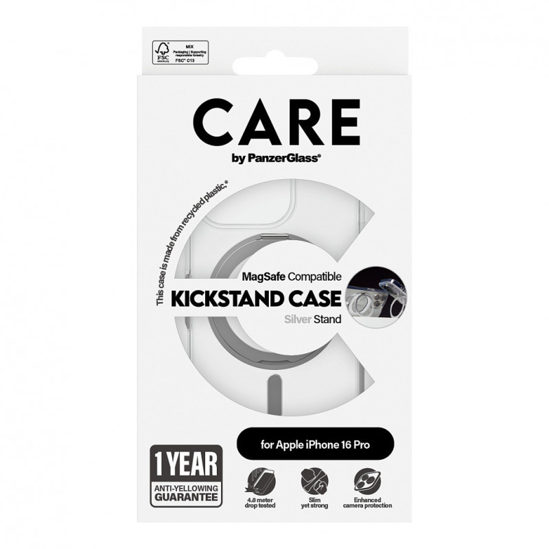 "PanzerGlass CARE™ by ® Case Transparent w. Silver Kickstand & MagSafe iPhone 16 Pro. Case type: Cover, Brand compatibility: Apple, Compatibility: Apple - iPhone 16 Pro, Product colour: Transparent"\n"One of our most anticipated new products is finally available! Every angle and corner has been drop-tested at 4.8 meters. Made from recycled plastic, this case offers phenomenal protection, wireless charging, and MagSafe compatibility, and includes our 1 Year Anti-Yellowing guarantee – no questions asked. This slim, light-weight protective kickstand case offers everything you want is a phone case. It’s practical design features a versatile kickstand for hands-free viewing, both vertical and horizontal. Now you – or your kids – can FaceTime, stream series, watch movies, and do yoga with ease, any where, any time … and hands free. It even includes enhanced camera protection to safeguard your selfies and photos.