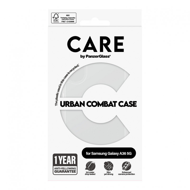 "PanzerGlass CARE™ by ® Urban Combat Case Transparent Samsung Galaxy A36 5G. Case type: Cover, Brand compatibility: Samsung, Compatibility: Samsung - Galaxy A36 5G, Product colour: Transparent"\n"Our top pick. Call sign bombshell. Phenomenal protection designed for urban exploration and adventure. Every angle and corner has been drop tested at 3.6 meters. The Urban Combat case, made from recycled plastic, is designed for wireless charging. And it comes with our 1 Year Anti-Yellowing guarantee – no questions asked.