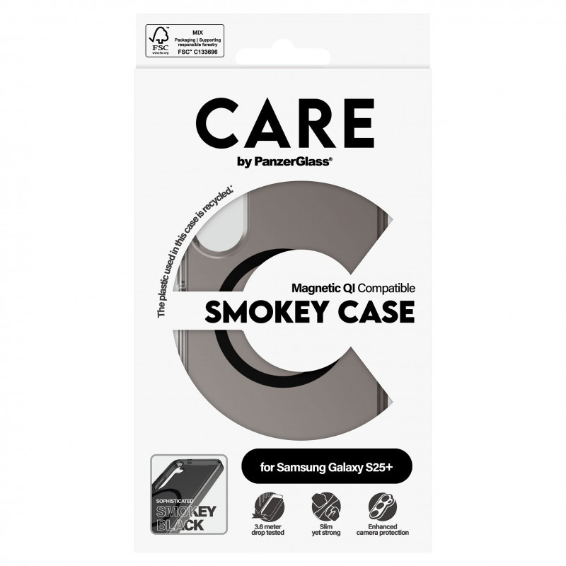 "PanzerGlass CARE™ by ® Urban Combat Case Smokey w. Black Qi Compatible Samsung Galaxy S25+. Case type: Cover, Brand compatibility: Samsung, Compatibility: Samsung - Galaxy S25+, Product colour: Black"\n"Say hello to Smokey – the ultimate choice for cool factor. This protective case is probably our hottest and most anticipated new arrival. Made from recycled plastic in the coolest Smokey finish, this slim yet super strong case offers phenomenal protection. Every angle and corner has been drop-tested at 3.6 meters and it offers enhanced camera protection, as well as Oi compatible.