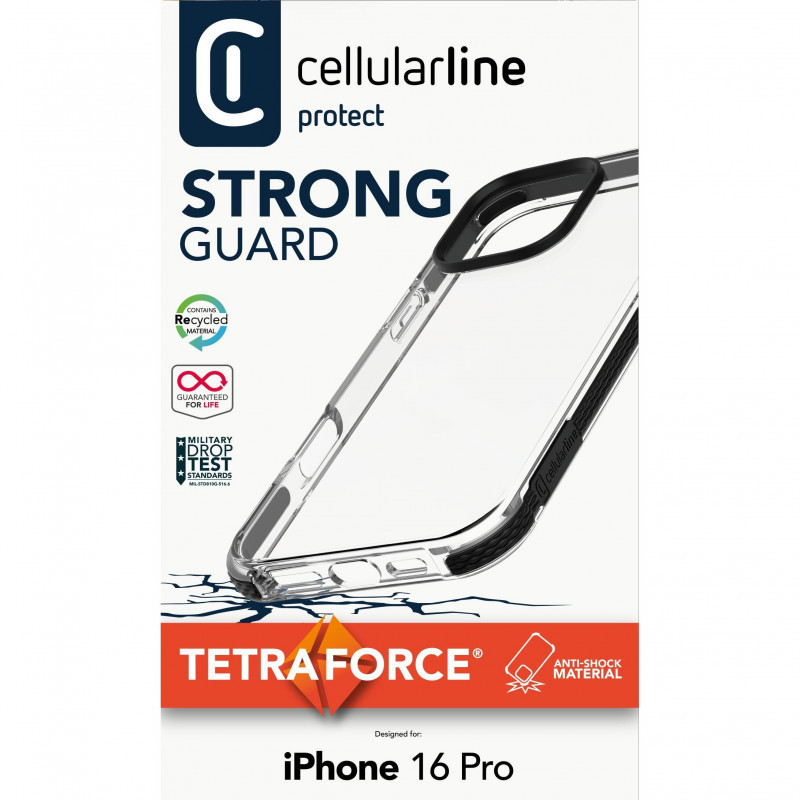"Cellularline Tetra Force Strong Guard - iPhone 16 Pro Ultra-protective, anti-shock flexible case with integrated Microban® antibacterial technology. Case type: Cover, Brand compatibility: Apple, Compatibility: iPhone 16 Pro, Maximum screen size: 16 cm (6.3""), Surface coloration: Monochromatic, Product colour: Black"\n"TETRA FORCE STRONG GUARD is the ultra-protective flexible case with a raised edge and reinforced corners, made from technologically advanced materials that absorb and disperse the shocks caused by falls. IDS (Impact Dissipating System)™ technology, developed by Cellularline, uses innovative Versaflex™ material which dissipates the energy created by the impact, preventing possible damage to the external and internal components of the smartphone. It is made with Microban® antibacterial technology, which eliminates up to 99.9% of bacterial growth on the case's surface and is constantly active because it is integrated into the Tetra Force Strong Guard material.Tetra Force Strong Guard has a lifetime guarantee: learn more by visiting Cellularline's Guaranteed For Life section"