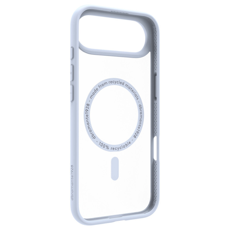 "dbramante1928 Grenen MS. Case type: Cover, Brand compatibility: Apple, Compatibility: iPhone 17 Air, Surface coloration: Monochromatic, Product colour: Blue"\n"The Grenen MagSafe bumper case is a stylish accessory for your phone made from 100% recycled and recyclable plastic materials. It offers robust protection with 2m (6.5 ft) impact protection and features raised edges that safeguard both the camera and screen from potential damage. The clear back design allows you to showcase your phone's original color, while the bumper can be color-matched for a coordinated look."