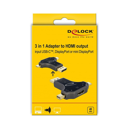 "DeLOCK 64060. Product colour: Black"\n"This monitor adapter by Delock can be connected selectively to an USB Type-C™, DisplayPort or mini DisplayPort interface, the output is via the HDMI connector.
