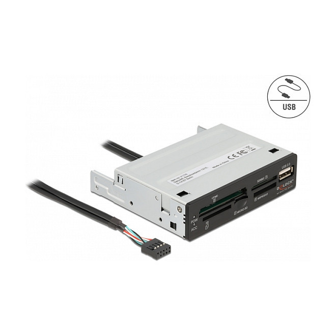 "DeLOCK 3.5″ USB 2.0 Card Reader 5 slot + 1 x USB 2.0 Type-A female. Compatible memory cards: CF, CF Type II, MMC, MMC Mobile, MMC+, MMCmicro, MS PRO, MicroSD (TransFlash), MicroSDHC, SD, xD, Product colour: Black, Grey, Supported drive bays: 3.5"". Interface: USB 2.0. Quantity per pack: 1 pc(s), Package type: Box. Compatible operating systems: Linux Kernel 5.11 or above Windows 8.1/8.1-64/10/10-64/11 PC with one free 3.5″ bay Motherboard..."\n"This card reader by Delock can be installed into a 3.5″ bay of a PC and will be connected to an internal USB 2.0 pin header male port. It has a five slotcard reader and enables the connection of one USB device."