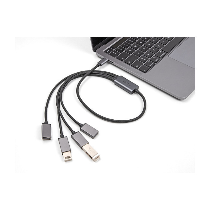"DeLOCK 4 Port USB 2.0 Cable Hub with USB Type-C connector 60 cm. Host interface: USB 2.0 Type-C, Hub interfaces: USB 2.0. Data transfer rate: 480 Mbit/s, Product colour: Black, Grey, Housing material: Metal. Power supply type: USB, Input current: 1.5 A. Windows operating systems supported: Windows 10, Windows 10 x64, Windows 11, Other operating systems supported: Android, ChromeOS. Quantity per pack: 1 pc(s), Package type: Box"\n"This USB hub by Delock can be connected to a computer, laptop or mobile device via the USB-C™ interface. It expands the computer by 4 USB Type-A ports. Different USB devices such as USB flash memory, card reader, external enclosure etc. can be connected.