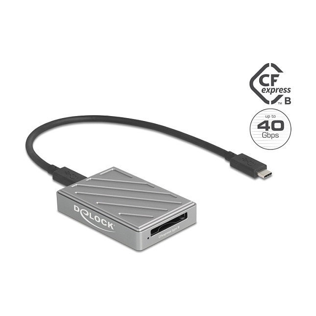 "DeLOCK 40 Gbps USB Type-C Card Reader for CFexpress type B memory cards. Compatible memory cards: CFexpress 2.0 Type B, Product colour: Grey, Data transfer rate: 40000 Mbit/s. Interface: USB4 Gen 3x2 Type-C. Width: 50 mm, Depth: 75 mm, Height: 14 mm. Quantity per pack: 1 pc(s), Package type: Hanging box. Cables included: USB Type-C to USB Type-C"\n"The card reader by Delock can be used for reading and writing CFexpress memory cards. The card reader can be connected to a PC or a mobile device via the USB interface. Thanks to the support of a maximum data transfer rate of up to 40 Gbps, even large amounts of data - such as 8K video recordings or RAW image series - can be transferred extremely quickly. The card reader is therefore ideal for professional users in the photo and video sector.