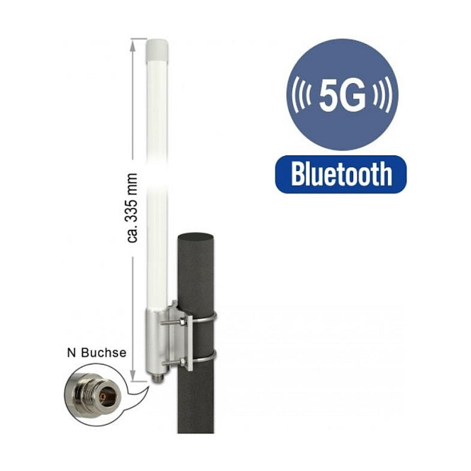 "DeLOCK 12631. Antenna gain level (max): 2.93 dBi, Impedance: 50 Ω, Horizontal beam width: 360°. Antenna type: Omni-directional antenna, Antenna connector type: N-type, Connector gender: Male. Power consumption (max): 100 W. Height: 335 mm, Diameter: 2.7 cm, Weight: 284 g. Quantity per pack: 1 pc(s)"\n"This waterproof antenna by Delock allows the usage of different 5G and LTE bands outdoors. It is completely compatible to GSM, UMTS, 5G LTE, ZigBee, Z-Wave, NB-IoT, WLAN 2.4 GHz, Bluetooth, ISM, DECT and LoRa.