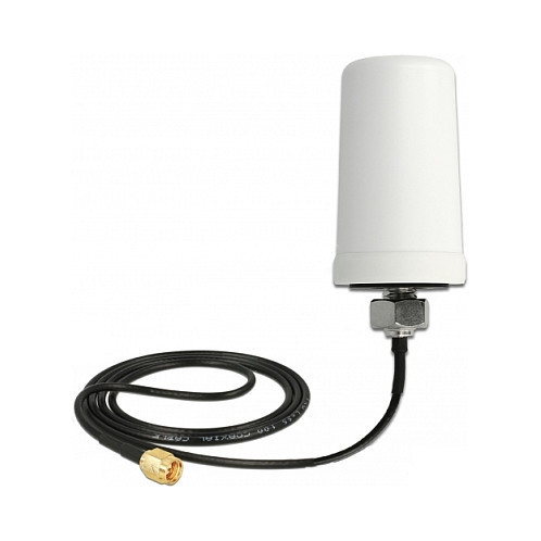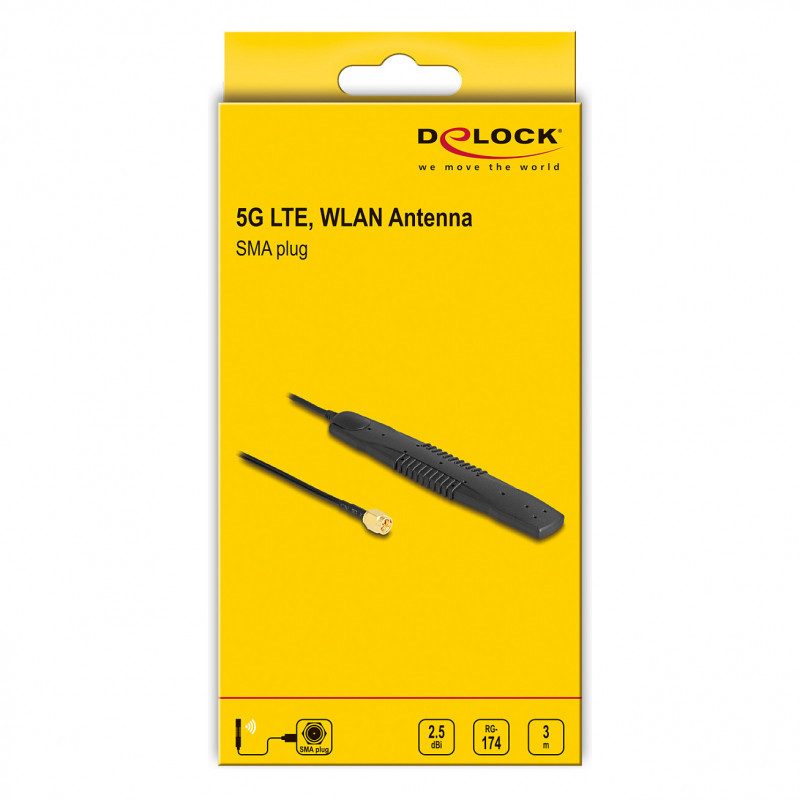 "DeLOCK 5G LTE, WLAN Antenna SMA plug 2,5 dBi omnidirectional fixed black self-adhesive. Antenna gain level (max): 2.5 dBi, Frequency band: 0.6 - 0.96 / 1.71 - 6 GHz, Impedance: 50 Ω. Antenna type: Omni-directional antenna, Antenna connector type: SMA, Voltage Standing Wave Ratio (VSWR): 2.0:1. Width: 22.8 mm, Depth: 129.5 mm, Height: 7 mm. Package type: Box. Quantity per pack: 1 pc(s)"\n"This 5G LTE and WLAN antenna can be installed indoors and can be used for reception of different bands. It is completely compatible to GSM, CDMA, GPRS, UMTS, LTE, 5G low band Sub-6 GHz, Bluetooth, WiFi, WLAN, Zigbee and ISM."