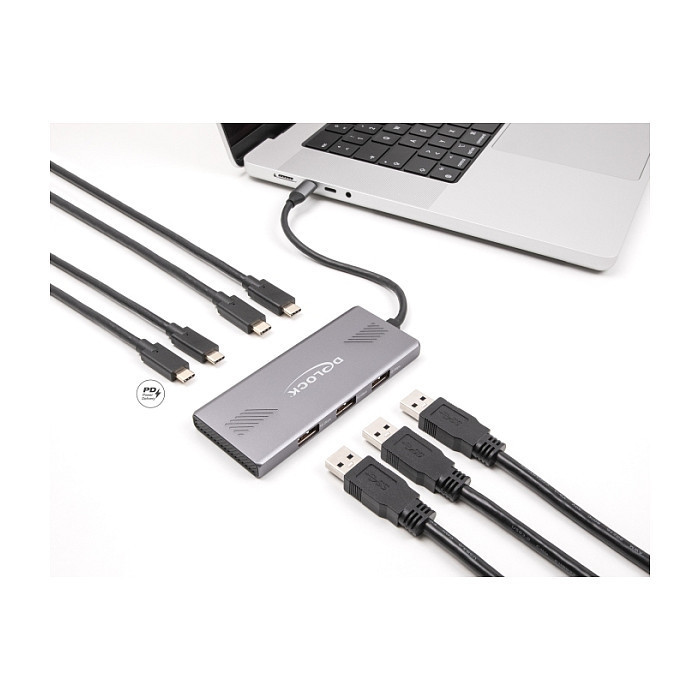 "DeLOCK 64313. Host interface: USB 3.2 Gen 2 (3.1 Gen 2) Type-C, Hub interfaces: USB 3.2 Gen 2 (3.1 Gen 2) Type-A, USB 3.2 Gen 2 (3.1 Gen 2) Type-C. Data transfer rate: 10000 Mbit/s, Product colour: Grey, Housing material: Aluminium. Power supply type: USB. Windows operating systems supported: Windows 10, Windows 10 x64, Windows 11, Mac operating systems supported: Mac OS X 12.0 Monterey, Mac OS X 13.0 Ventura, Mac OS X 14.0 Sonoma, Mac OS X 15.0 Sequoia, Linux operating systems supported: Linux Kernel 6.2, Linux Kernel 6.5. Width: 44 mm, Depth: 117 mm, Height: 9 mm"\n"The USB hub by Delock can be connected via USB Type-C™ interface to a PC or laptop. It has three USB Type-A connectors as well as four USB Type-C™ connectors. Different USB devices such as USB flash memory, card reader, external enclosure etc. can be connected.