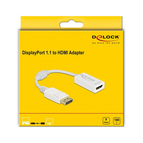 "DeLOCK Adapter DisplayPort 1.1 male to HDMI female Passive white. Cable length: 0.15 m, Connector 1: DisplayPort, Connector 2: HDMI Type A (Standard)"\n"This adapter by Delock enables the connection of an HDMI monitor to the system via a free DisplayPort interface."