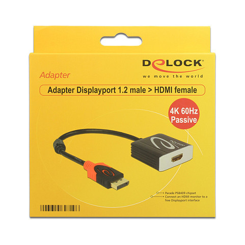 "DeLOCK 0.2m, Displayport/HDMI. Cable length: 0.2 m, Connector 1: DisplayPort, Connector 2: HDMI. Package type: Box. Quantity per pack: 1 pc(s)"\n"This adapter by Delock enables the connection of an HDMI monitor to the system via a free Displayport interface. The adapter supports a resolution up to 4K Ultra HD at 60 Hz and is backward compatible to Full-HD 1080p."