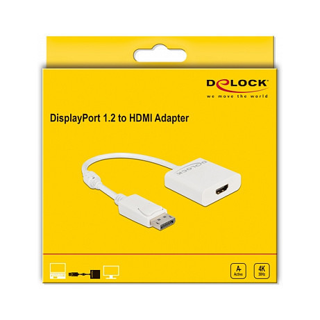 "DeLOCK Adapter DisplayPort 1.2 male to HDMI female 4K Active white. Cable length: 0.2 m, Connector 1: DisplayPort, Connector 2: HDMI. Quantity per pack: 1 pc(s)"\n"This adapter by Delock enables the connection of an HDMI monitor to the system via a free DisplayPort interface. The adapter supports a resolution up to 4K Ultra HD at 30 Hz and is backward compatible to Full-HD 1080p. The adapter offers an active conversion, thus it is also suitable for graphics cards that are not capable of outputting DP++ signals."