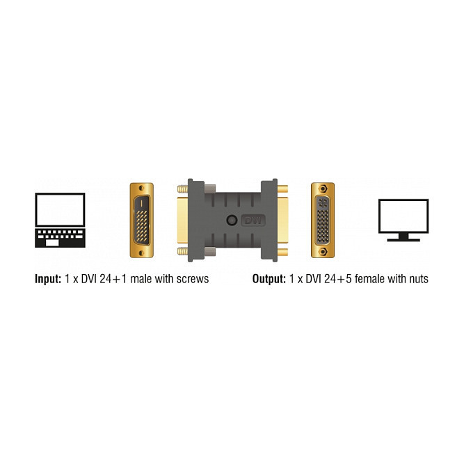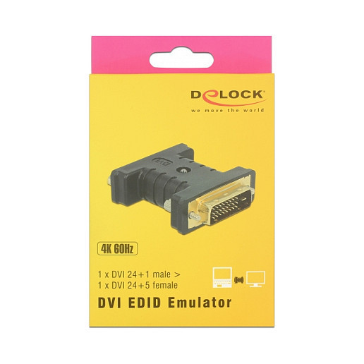 "DeLOCK 63313. Connector 1: 1 x DVI 24+1, Connector 2: 1 x DVI 24+5. Product colour: Black"\n"This adapter by Delock emulates a monitor so that the signal source does not switch off the signal or change the resolution, even without a connected monitor. The adapter contains a standard set of EDID/DDC data, but it can also read and save the data of a connected monitor."