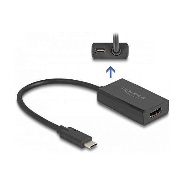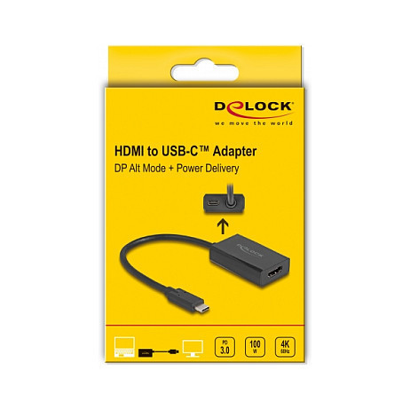 "DeLOCK Adapter HDMI female to USB Type-C male (DP Alt Mode) 4K with PD 100 W. Maximum resolution: 3840 x 2160 pixels, Supported graphics resolutions: 3840 x 2160, Supported video modes: 2160p. Product colour: Black, Cable type: Round cable. Package type: Hanging box. Quantity per pack: 1 pc(s), Packaging content: Adapter DisplayPort to USB Type-C User manual"\n"This adapter by Delock enables the connection of a USB Type-C™ (DisplayPort Alternate Mode) monitor to a free HDMI interface of a PC or laptop.
