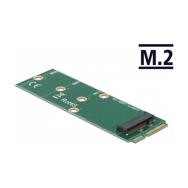 "DeLOCK Adapter mSATA to M.2 Key B slot. Host interface: mSATA, Output interface: M.2. Purpose: PC. Width: 30 mm, Depth: 95 mm, Height: 4 mm"\n"This adapter by Delock enables the connection of an M.2 SSD in 2280, 2260 and 2242 format. The adapter can be installed into the system through an mSATA interface."