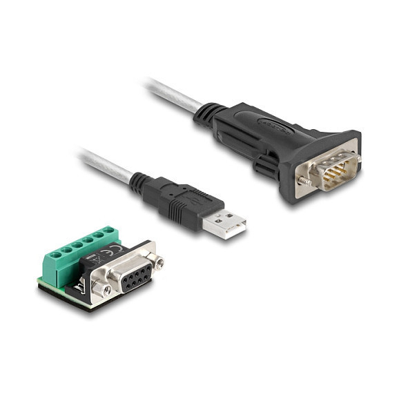 "DeLOCK Adapter USB 2.0 Type-A to 1 x Serial RS-422/485 male with 6 pin terminal block 5 V 1 m. Product colour: Black, Transparent, Cable length: 1 m, Connector 1: USB Type-A. Quantity per pack: 1 pc(s), Package type: Hanging box"\n"This USB 2.0 to serial adapter by Delock provides a standard RS-422 and RS-485 connection for measuring devices, POS systems, printers, modems, IoT devices etc.