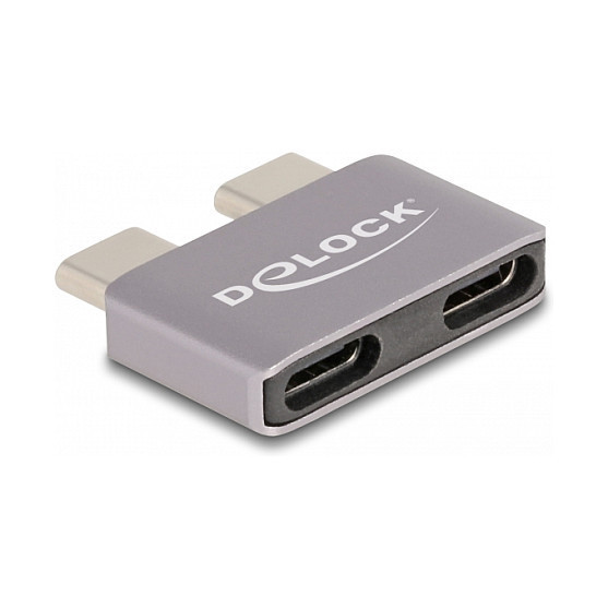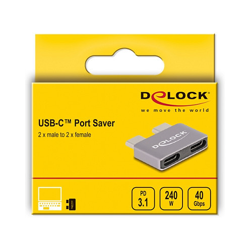 "DeLOCK Adapter USB 40 Gbps USB Type-C 2 x male to 2 x female port saver metal. Connectivity technology: Docking, Host interface: USB 3.2 Gen 1 (3.1 Gen 1) Type-C, USB Power Delivery up to: 240 W. Product colour: Black, Housing material: Aluminium, Compatibility: MacBook Pro 14″ (2021), MacBook Pro 16″ (2021), MacBook Air (M2 2022). Width: 16 mm, Depth: 27 mm, Height: 6 mm. Quantity per pack: 1 pc(s)"\n"This USB-C™ adapter by Delock can be used for the connection of USB-C™ devices with two USB Type-C™ interfaces, e.g. Apple MacBook. It can be also connected to two free USB-C™ port in order to prevent the interface from damage when it is under usage for high contact durability.