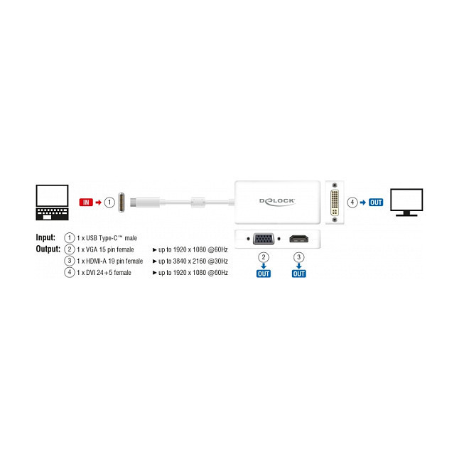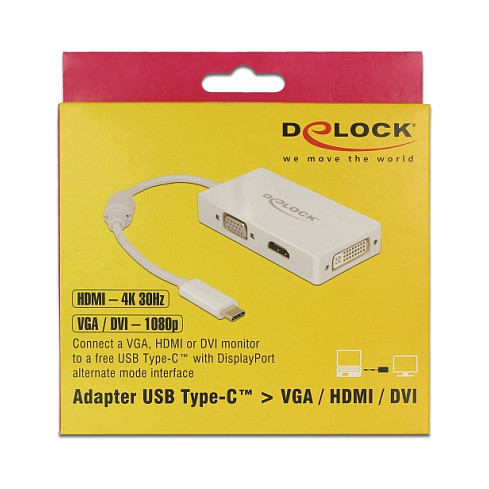 "DeLOCK 63924. Connector(s): USB Type-C. Maximum resolution: 3840 x 2160 pixels, Product colour: White, Maximum refresh rate: 60 Hz. Power consumption (typical): 1.35 W. Package type: Box"\n"This adapter by Delock is suitable for the connection of a VGA, HDMI or DVI monitor to a computer with USB-C interface and DisplayPort alternate mode support. Thus, the adapter can be connected to different laptops like MacBook, Chromebook and similar. In addition, the adapter can also be operated on a Thunderbolt 3 interface. Only one monitor can be used on the adapter."