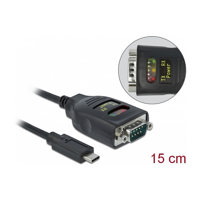 "DeLOCK Adapter USB Type-C to 1 x Serial RS-232 DB9 with 15 kV ESD protection. Product colour: Black, Cable length: 0.15 m, Connector 1: USB Type-C. Quantity per pack: 1 pc(s). Weight: 26 g"\n"This USB Type-C™ to serial adapter by Delock provides an RS-232 port for meters, POS systems, printers, modems, IoT devices, etc. The three LEDs at the RS-232 port indicate the transmission and reception status as well as the USB power."