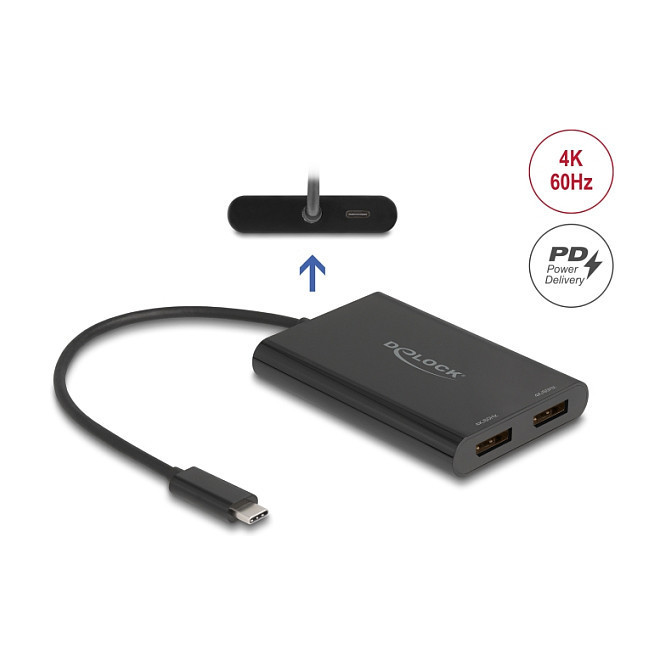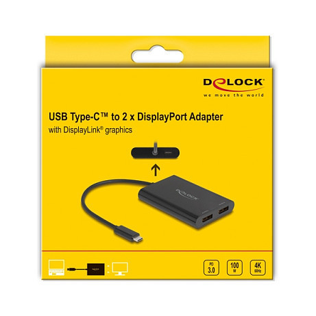 "DeLOCK 64308. Cable length: 0.2 m, Connector 1: USB Type-C, Connector 2: DisplayPort + USB Type-C. Width: 62 mm, Depth: 90 mm, Height: 14 mm. Package type: Hanging box. Quantity per pack: 1 pc(s)"\n"The adapter by Delock enables the connection of additional DisplayPort monitors, projectors, etc. to a PC or laptop via USB-C™ connector.