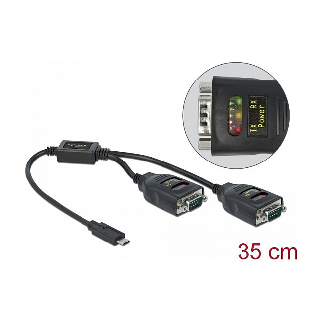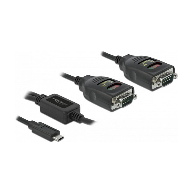 "DeLOCK Adapter USB Type-C to 2 x Serial RS-232 DB9 with 15 kV ESD protection. Product colour: Black, Cable length: 0.35 m, Connector 1: USB Type-C. Quantity per pack: 1 pc(s). Weight: 62 g"\n"This USB Type-C™ to serial adapter by Delock provides two RS-232 DB9 interfaces for printers, measuring instruments, controllers, IoT devices etc. At each of the RS-232 ports three LEDs indicate the transmission and reception status as well as the USB power."