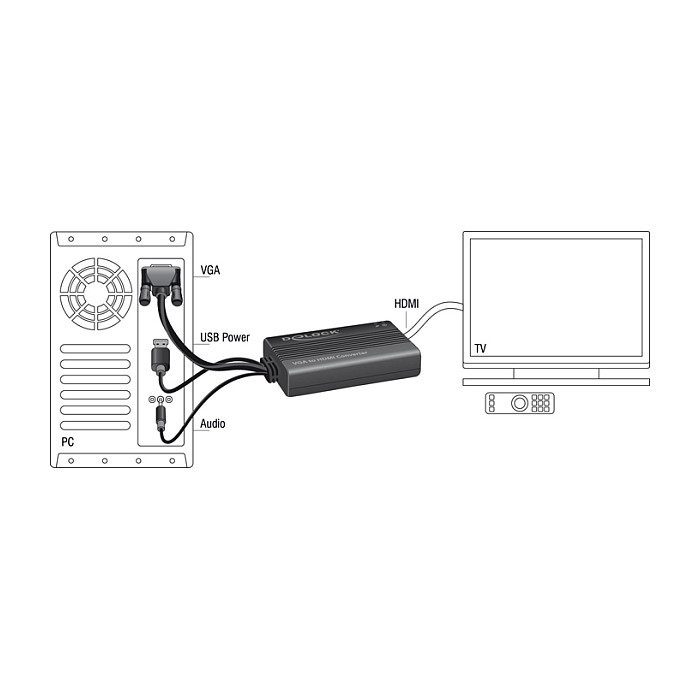 "DeLOCK 62597. Cable length: 0.25 m, Connector 1: HDMI Type A (Standard), Connector 2: VGA (D-Sub) + 3.5mm + USB Type-A"\n"This VGA to HDMI adapter by Delock can be used for the connection of a HDMI display to your PC or notebook. By using the stereo jack cable on the PC or notebook you can transmit the audio signal through this adapter. Furthermore this adapter will be powered via USB hence you do not need an additional power supply."