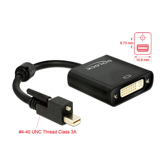 "DeLOCK 62639. Cable length: 0.25 m, Connector 1: Mini DisplayPort, Connector 2: DVI-I. Cable diameter: 5.5 mm"\n"This adapter enables you to connect e.g. a DVI monitor through a free mini Displayport interface. The adapter supports a resolution up to Ultra HD (4K) and is backward compatible to Full-HD 1080p. The adapter offers an active conversion, thus it is also suitable for graphics cards that are not capable of outputting DP++ signals. The screw of the mini Displayport connector secures the connection and prevents accidental unplugging of the cable."