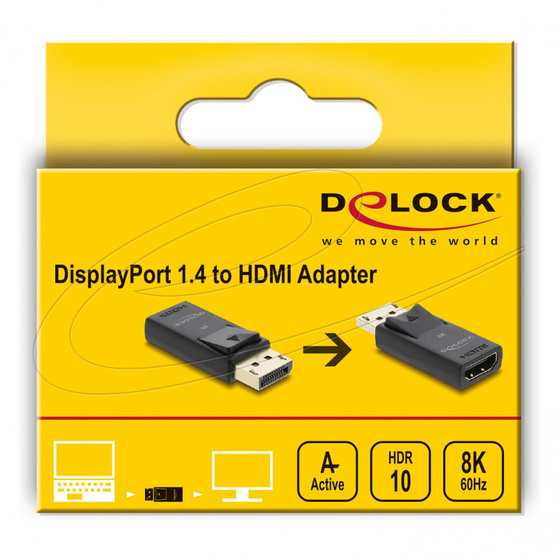 "DeLOCK 61084. Connector 1: DisplayPort, Connector 2: HDMI, Connector contacts plating: Gold. Product colour: Black"\n"This adapter by Delock enables the connection of an HDMI monitor, projector or TV to the device with a free DisplayPort interface. Due to the small dimensions, the adapter is ideal as on the go companion.
