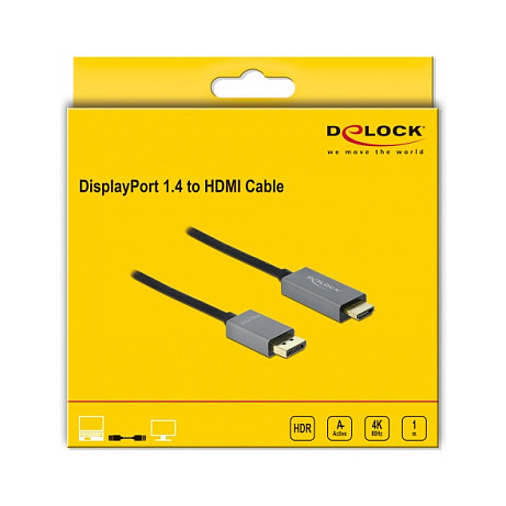 "DeLOCK Active DisplayPort 1.4 to HDMI Cable 4K 60 Hz (HDR) 1 m. Cable length: 1 m, Connector 1: DisplayPort, Connector 2: HDMI. Cable diameter: 5 mm"\n"This cable by Delock allows the connection of an HDMI monitor or projector to a PC or laptop with DisplayPort interface.