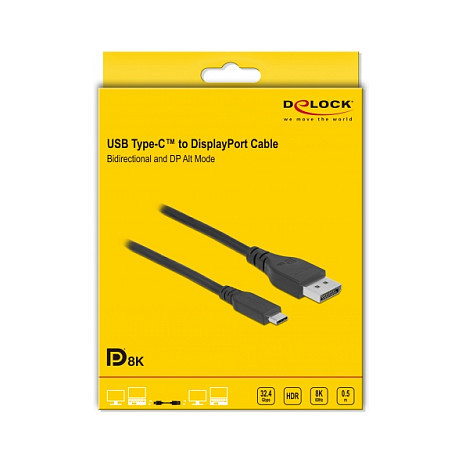 "DeLOCK Bidirectional USB Type-C to DisplayPort Cable (DP Alt Mode) 8K 60 Hz 0.5 m DP 8K certified. Cable length: 0.5 m, Connector 1: USB Type-C, Connector 2: DisplayPort. Cable diameter: 4.8 mm. Package type: Box"\n"This DP 8K certified USB-C™ to DisplayPort cable by Delock enables the connection between different devices with USB Type-C and DisplayPort connectors.