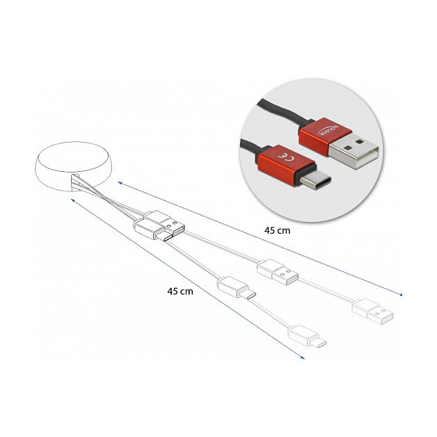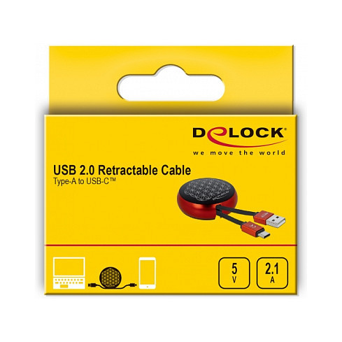 "DeLOCK USB 2.0 Retractable Cable Type-A to USB-C™ black / red. Cable length: 0.92 m. Connector 1: USB A, Connector 2: USB C, USB version: USB 2.0, Product colour: Black, Red"\n"Description
